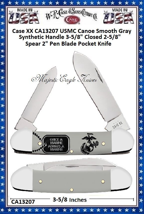 W.R. Case & Sons Cutlery CA13207 Case XX USMC Canoe Smooth Gray Synthetic Handle 3-5/8" Closed 2-1/2" Clip 1-7/8" Spey 1-3/4"Sheepsfoot Blade Pocket Knife! This knives honor America's Expeditionary Force in readiness, a most formidable branch of the U.S. military that dates back to 1775. The Canoe knife gets its name from its canoe-like shaped handle. This durable folding knife features two blades on opposing ends, the Spear blade and the Pen blade. The Spear blade is used as a heavy-duty utility tool and great for piercing. The Pen blade is great for light work and good for sharpening. The Canoe knife can be used for fishing related jobs like cutting hooks off lines, cleaning fish, and cutting through finishing line easily. This knife is constructed with Case Tru-Sharp™ stainless steel, which is a special high-carbon steel that helps the blades hold an edge longer than conventional steel. It also offers extraordinary blade strength and corrosion resistance. Comes conveniently packaged in a box. Made in Bradford, PA, USA from domestic and imported materials.