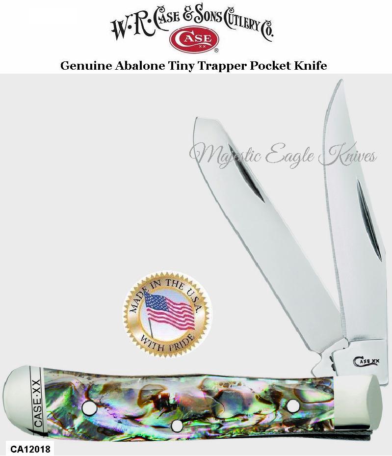 W.R. Case & Sons Cutlery CA12018 Genuine Abalone Tiny Trapper Pocket Knife! These beautiful iridescent Abalone knives gleam with some of the most striking colors found in nature! W.R. Case & Son's Cutlery presents The Limited Edition CA12018 the Tiny Trapper. This classic American Case iridescent Abalone Knife! Gleams with some of the most striking colors found in nature is 2-3/8 inches long closed and comes complete with a Limited Lifetime Manufacturer Warranty. It's handcrafted in the U.S.A. The handle is Genuine Abalone. The bolsters are Nickel Silver. So, whether you're hunting for authentic cutlery to collect, a top quality knife to give as a gift, or a superior blade to carry, don't let this treasure get away! Manufacturing knives in the USA since 1889, W.R. Case & Sons Cutlery Company continues to dominate as an American cutlery classic. This is because they still rely on old-fashioned but proven techniques for unmatched quality, craftsmanship and attention to detail. Using only high quality materials, such as naturally shed India Stag or Brazilian Cattle Bone, every knife displays durability AND personality. Handmade Case XX knives still remain the most treasured and sought after by users and collectors alike. Case knives have been a trusted companion, as well as a tool, for generations.