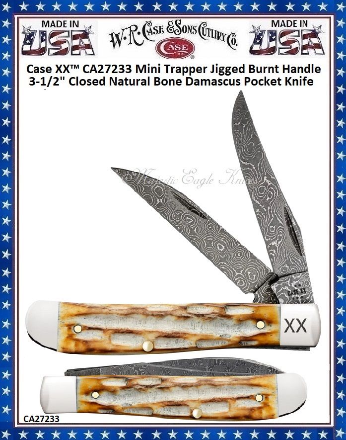 W.R. Case & Sons Cutlery Case XX™ CA27233 Mini Trapper Jigged Burnt Bone Handle Damascus Clip/Wharncliffe) Pocket Knife! This Classic American Case Mini Trapper is about 3 1/2 inches long (folded/closed) and weighs approximately 2.7 ounces. The handle is Deep Canyon jigged Burnt Natural Bone. The bolsters are XX Engraved Nickel Silver. This knife utilizes a 2 3/4" Clip blade and 2 3/4" Wharncliffe blade. Stamped with pattern number 6207W DAM, the blade material is Damascus Steel. This Mini Trapper is a professional-grade tool that comes with a Limited Lifetime Manufacturer's Warranty and is not designed nor intended to be used on or against humans. So, whether you're hunting for authentic cutlery to collect, a top quality knife to give as a gift, or a superior tool to use,